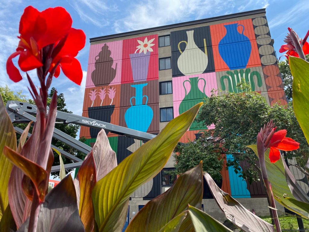 The mural, he painted on the side of a public housing building where a fire occurred and a person was killed, shows 12 flower pots which represent community and diversity.