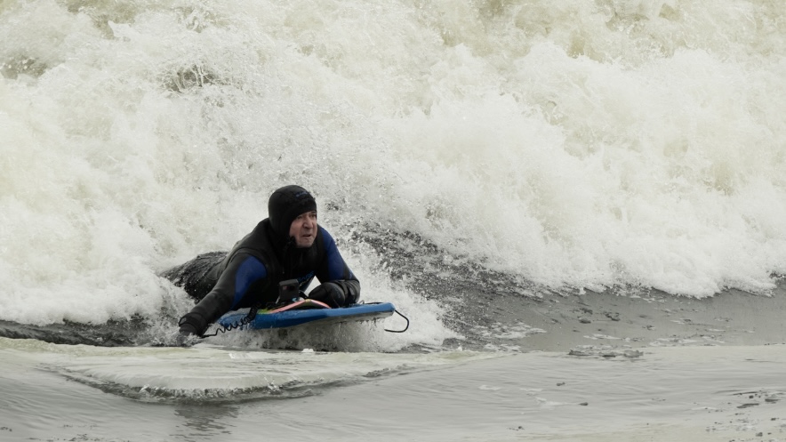 Carlos Hebert Plante He wears two suits and after that, he jumps on his boogie board in the frigid water of the St-Lawrence river close to downtown Montreal. There is a standing wave behind Habitat 67 building build for the universal exhibition en 1967. Montréal, Quebec: February 3rd, 2023 (Credit: Bernard Brault)