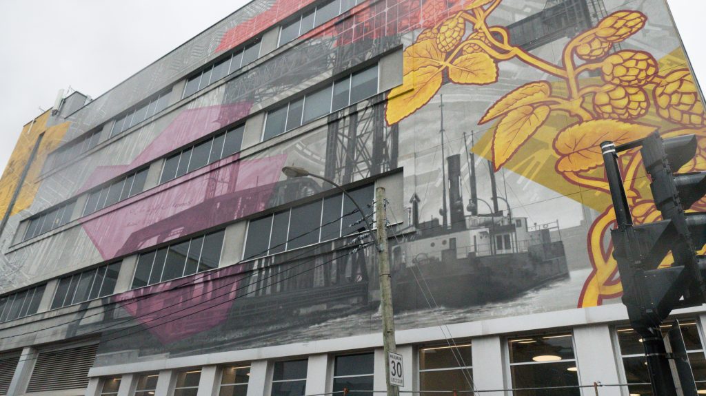 The beer industry represented with paintings of hops – a flower commonly used to brew beer – and a depiction of the historical Dow Brewery. As well as the bridges and switch tower of the Lachine Canal – its construction marking Montreal’s first industrialization boom in the 19th century.