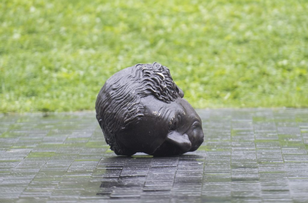 The head of a statue of Sir John A. MacDonald is shown torn down following a demonstration in Montreal, Saturday, Aug. 29, 2020, where they protested to defund the police with a goal to end all systemic racism within all sectors of the Canadian government. THE CANADIAN PRESS/Graham Hughes