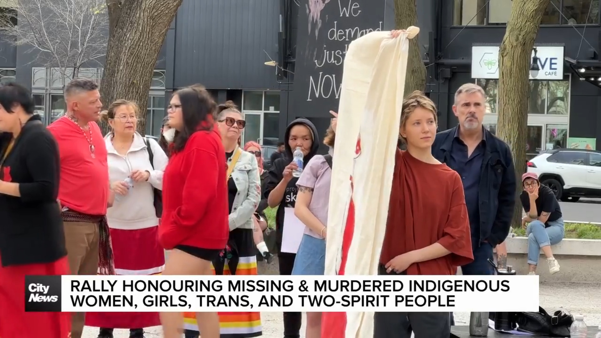 Montrealers came together for a rally at Cabot Square on Monday night to honour Missing and Murdered Indigenous Women, Girls, Trans, and Two-Spirit People.