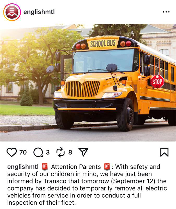 In a social media post, the EMSB writes: “Attention Parents: With safety and security of our children in mind, we have just been informed by Transco that tomorrow (September 12) the company has decided to temporarily remove all electric vehicles from service in order to conduct a full inspection of their fleet.”